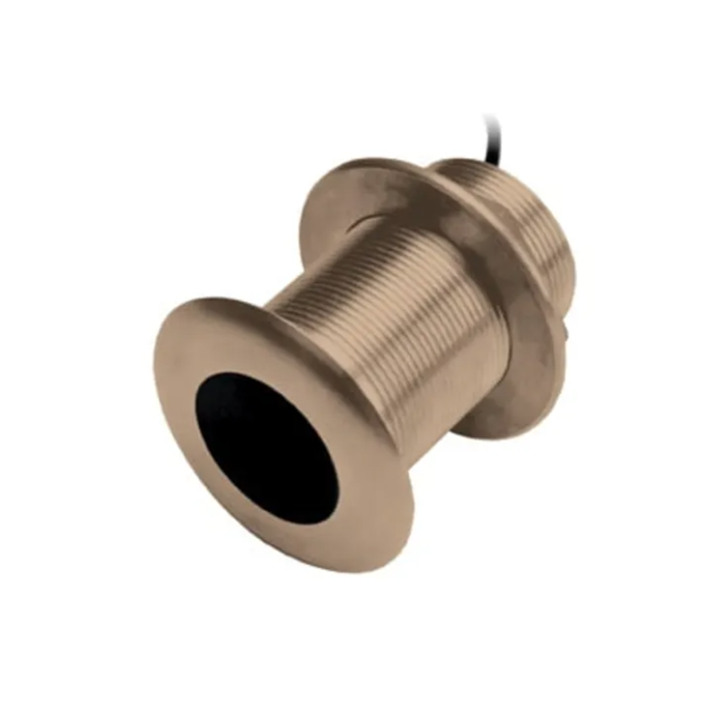 This 8-pin 300 W bronze thru-hull mount transducer has a depth of 600 ft; an operating frequency of 95-155 kHz; a beamwidth of 26/17 degrees; and a 0 to 7 degree deadrise.
