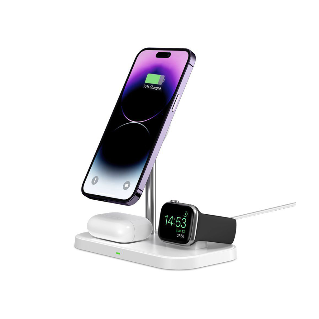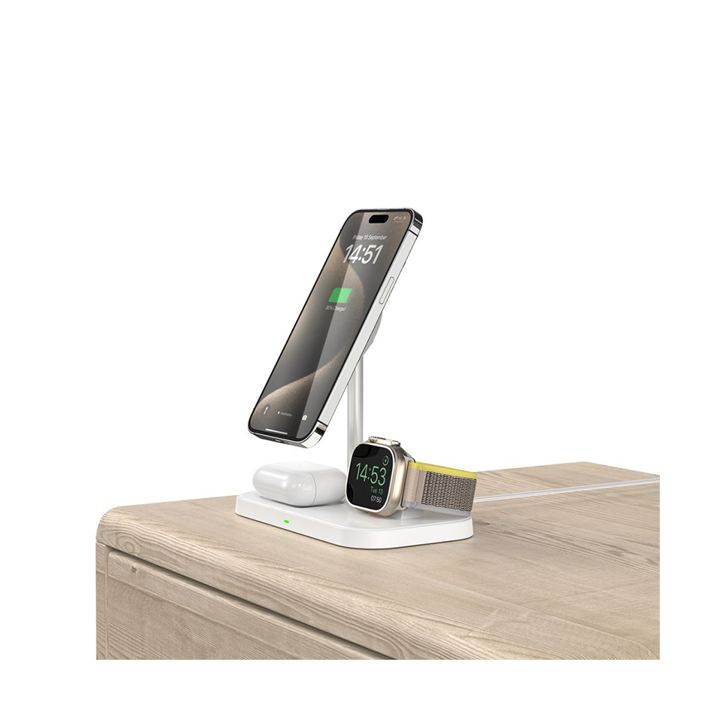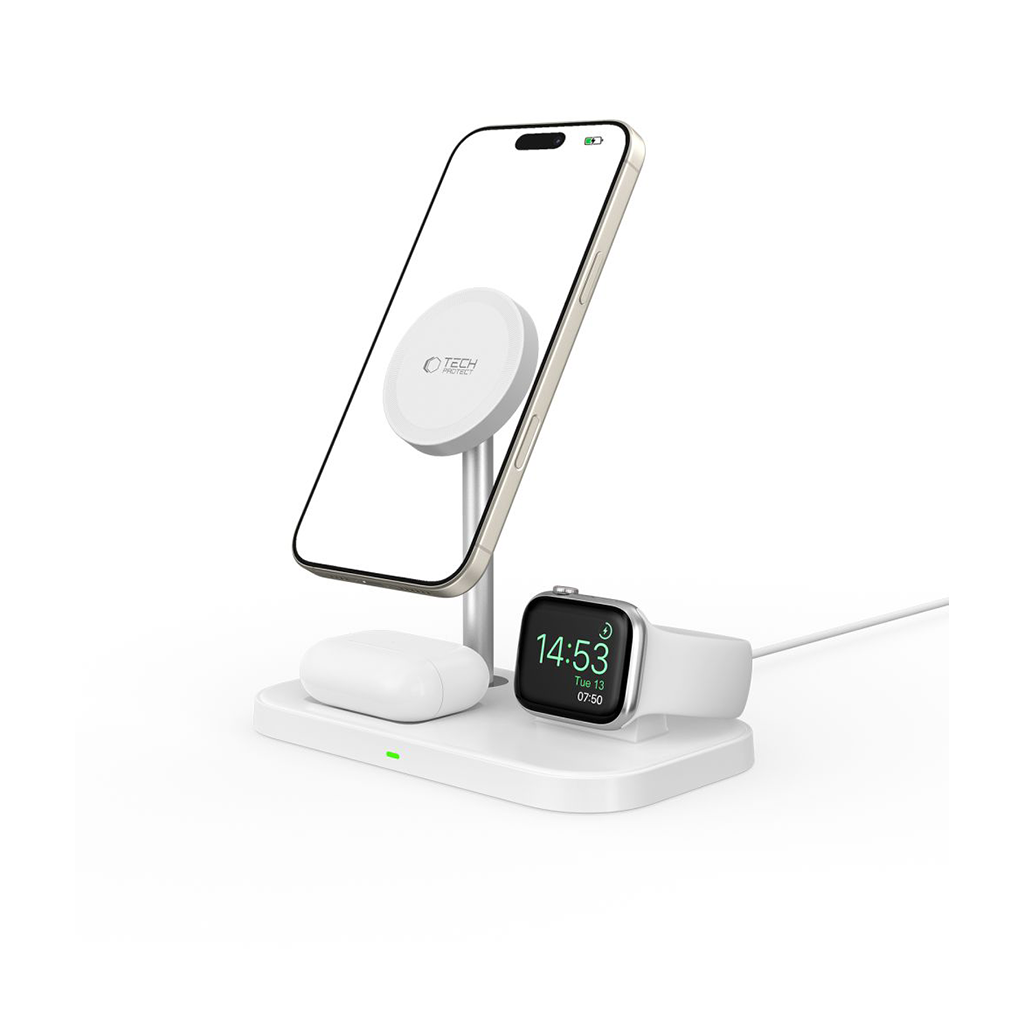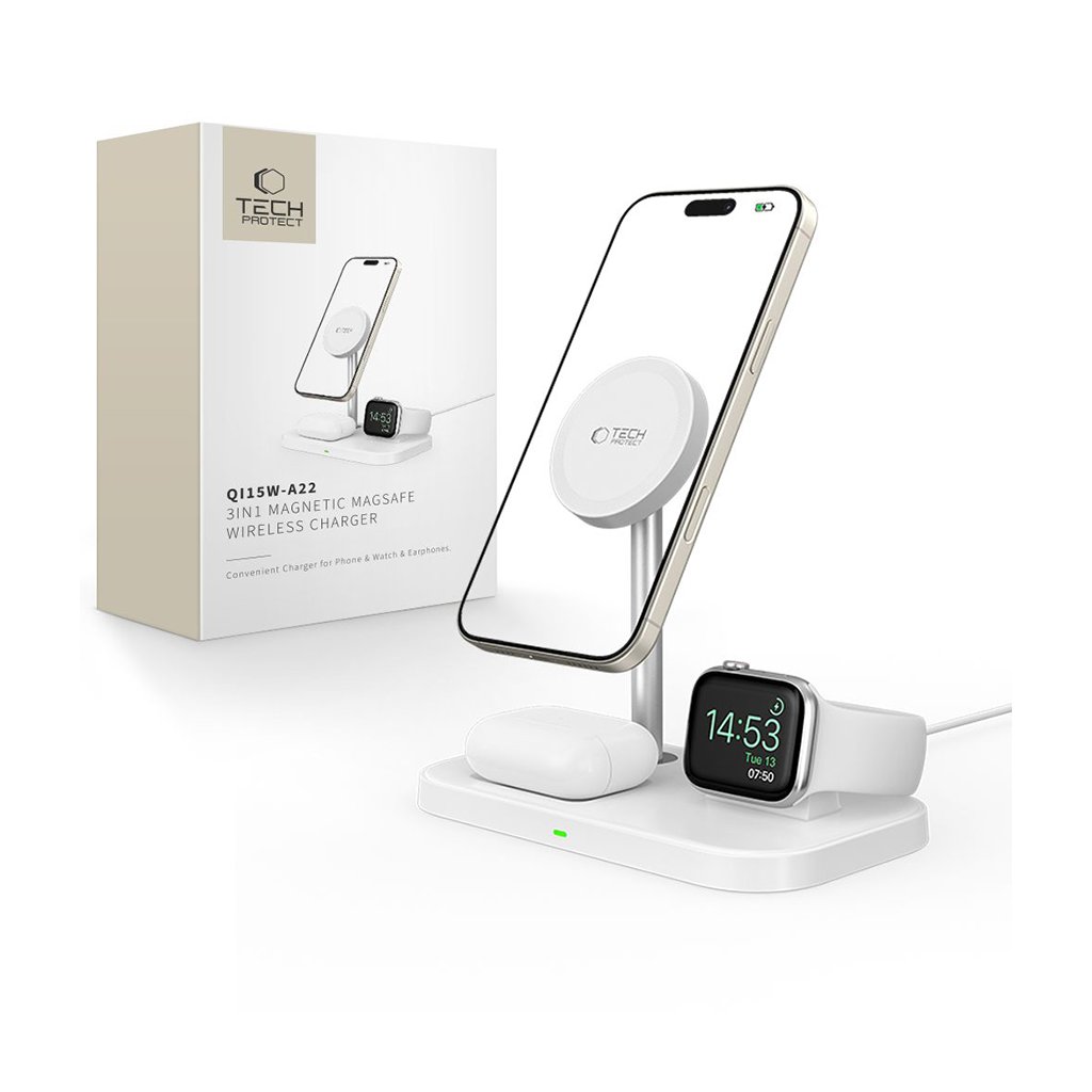 Tech‑Protect QI15W‑A22 on kõikehõlmav laadimislahendus, mis võimaldab laadida korraga kolme seadet: MagSafe ühilduvat nutitelefoni, Apple Watch’i ning juhtmevabasid kõrvaklappe. Tänu magnetilisele MagSafe‑ühendusele kinnitub telefon täpselt laadimisplaadile, tagades stabiilse ja optimaalse juhtmevaba laadimise kogemuse.