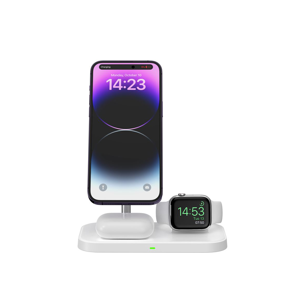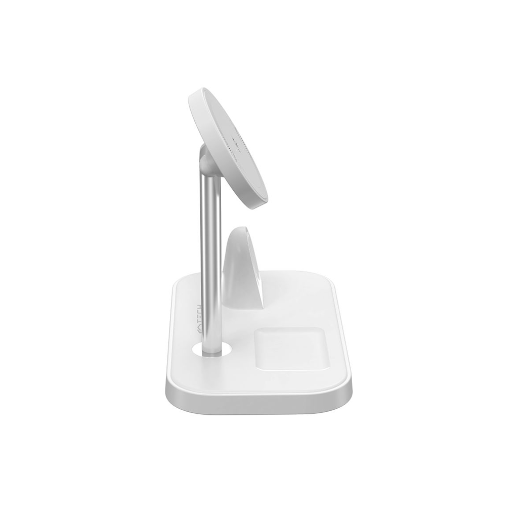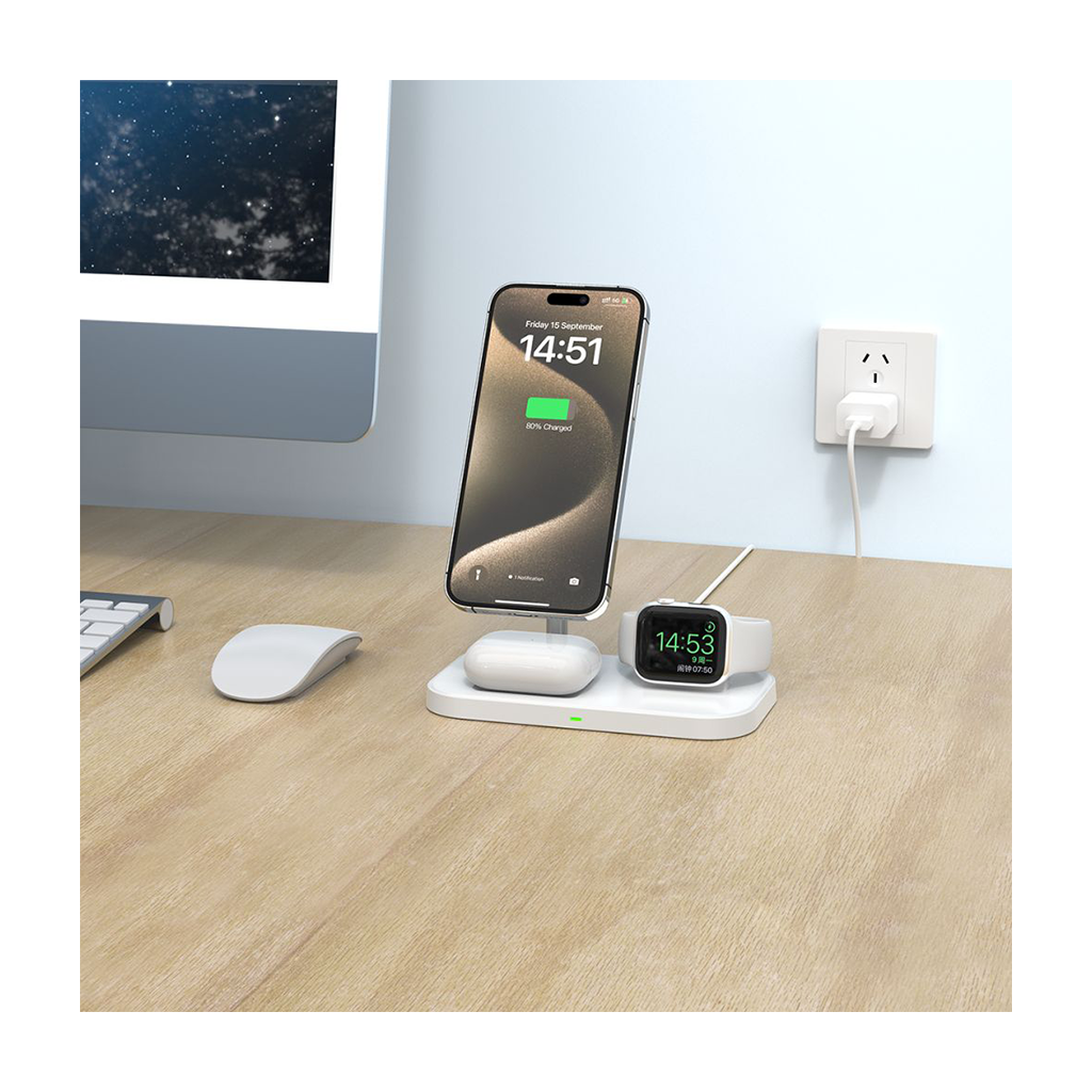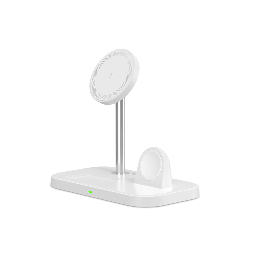 Tech‑Protect QI15W‑A22 on kõikehõlmav laadimislahendus, mis võimaldab laadida korraga kolme seadet: MagSafe ühilduvat nutitelefoni, Apple Watch’i ning juhtmevabasid kõrvaklappe. Tänu magnetilisele MagSafe‑ühendusele kinnitub telefon täpselt laadimisplaadile, tagades stabiilse ja optimaalse juhtmevaba laadimise kogemuse.
