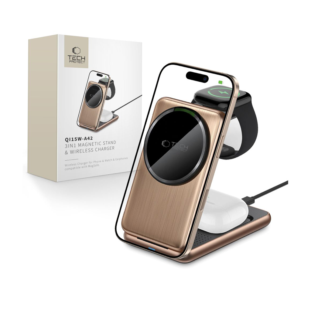 Qi15W‑A42 on universaalne laadimisjaam, mis võimaldab samaaegselt laadida kolme Apple’i seadet: MagSafe ühilduvat iPhone’i, Apple Watch’i ja juhtmevabasid kõrvaklappe. Tänu magnetilisele MagSafe‑ühendusele kinnitub telefon täpselt laadimispunktile, tagades stabiilse ja tõhusa laadimise ilma kaablite segaduseta.