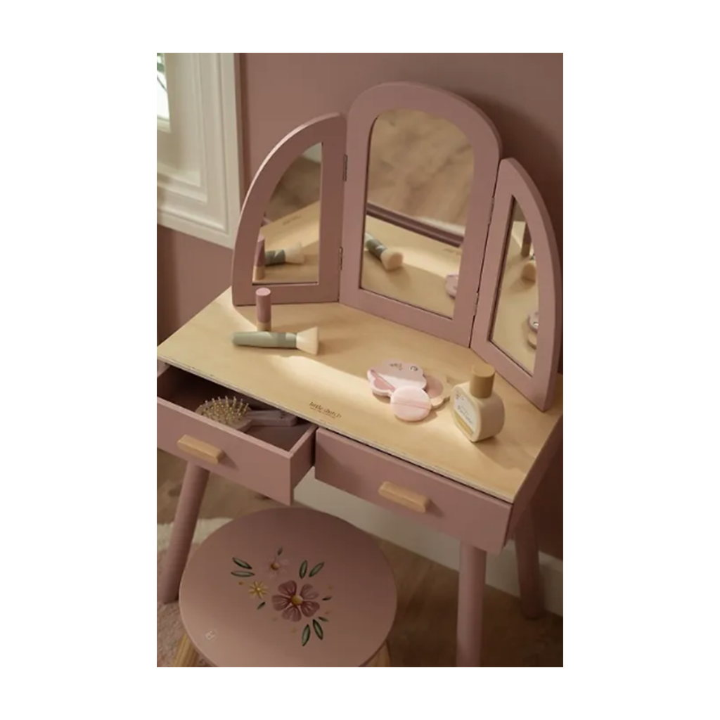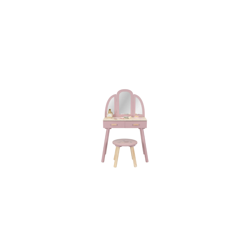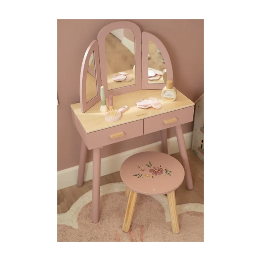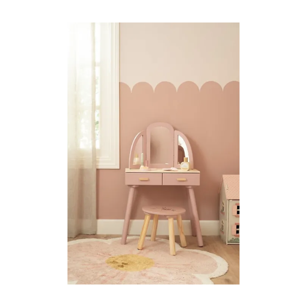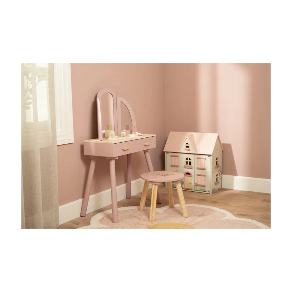 A charming stool with floral decoration completes the set, making it perfect for imaginative play and imitating adult style. This dressing table brings a touch of fairyland to your home – where every day can be filled with splendor and play!