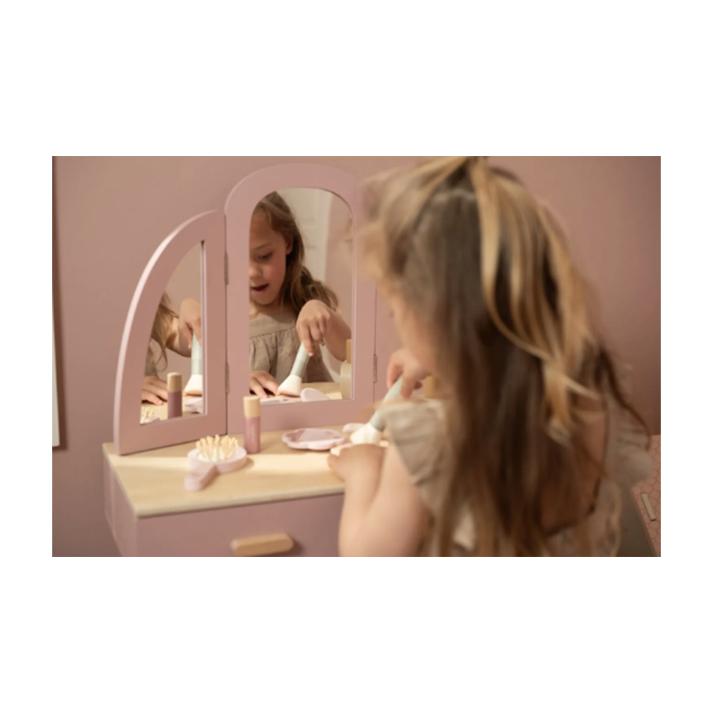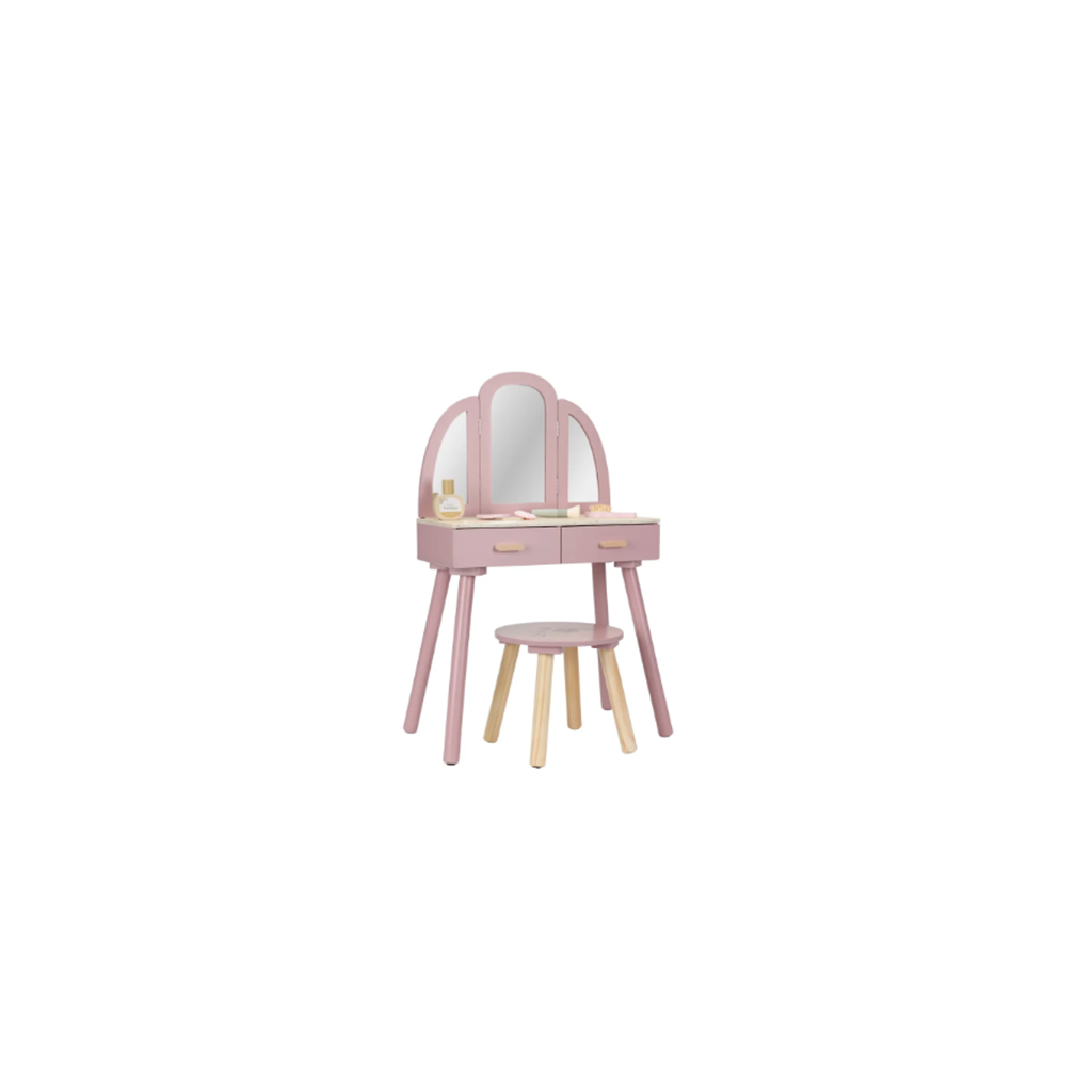 A gorgeous pink dressing table is every little princess´ dream! Let your imagination run wild and feel like a real princess at this beautiful wooden dressing table! The stylish three-part mirror adds a touch of elegance and allows you to admire yourself from all angles. The spacious drawers offer plenty of storage space for lovely accessories, and the six wooden beauty products included complete the look.