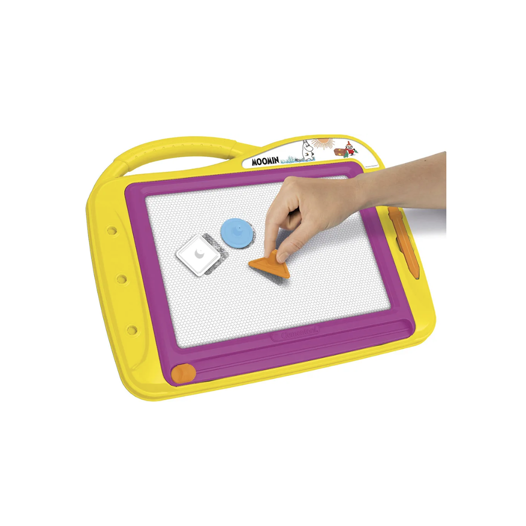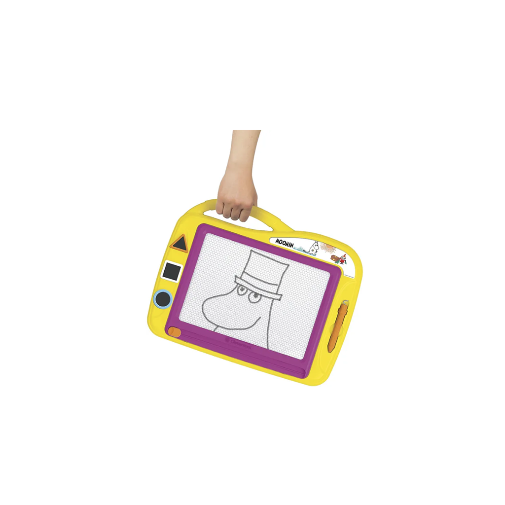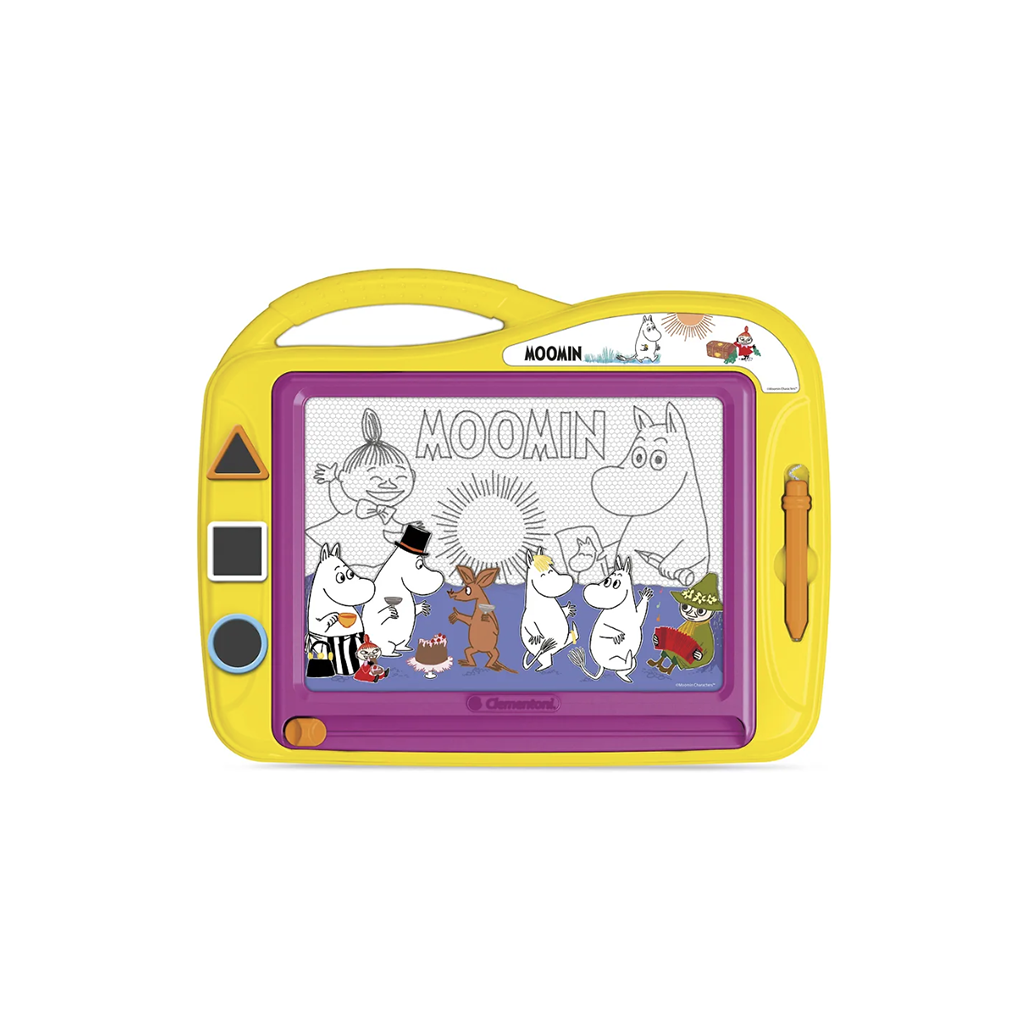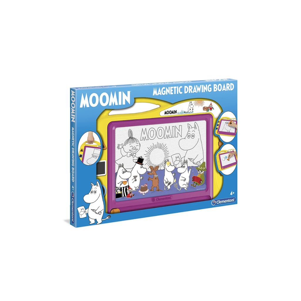 Let your imagination run wild! Draw or stamp pictures on the magnetic drawing board, wipe the board clean and start over. The Moomin-themed drawing board comes with a pen attached to a string, three stamps and a handy carrying handle. Recommended for ages 4 and up.