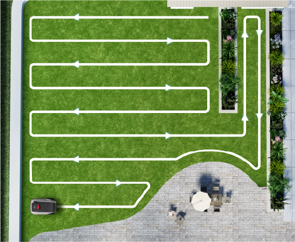 Robot arvutab automaatselt kõige efektiivsema niidutrajektoori, vähendades kattuvust ja suurendades töökiirust.